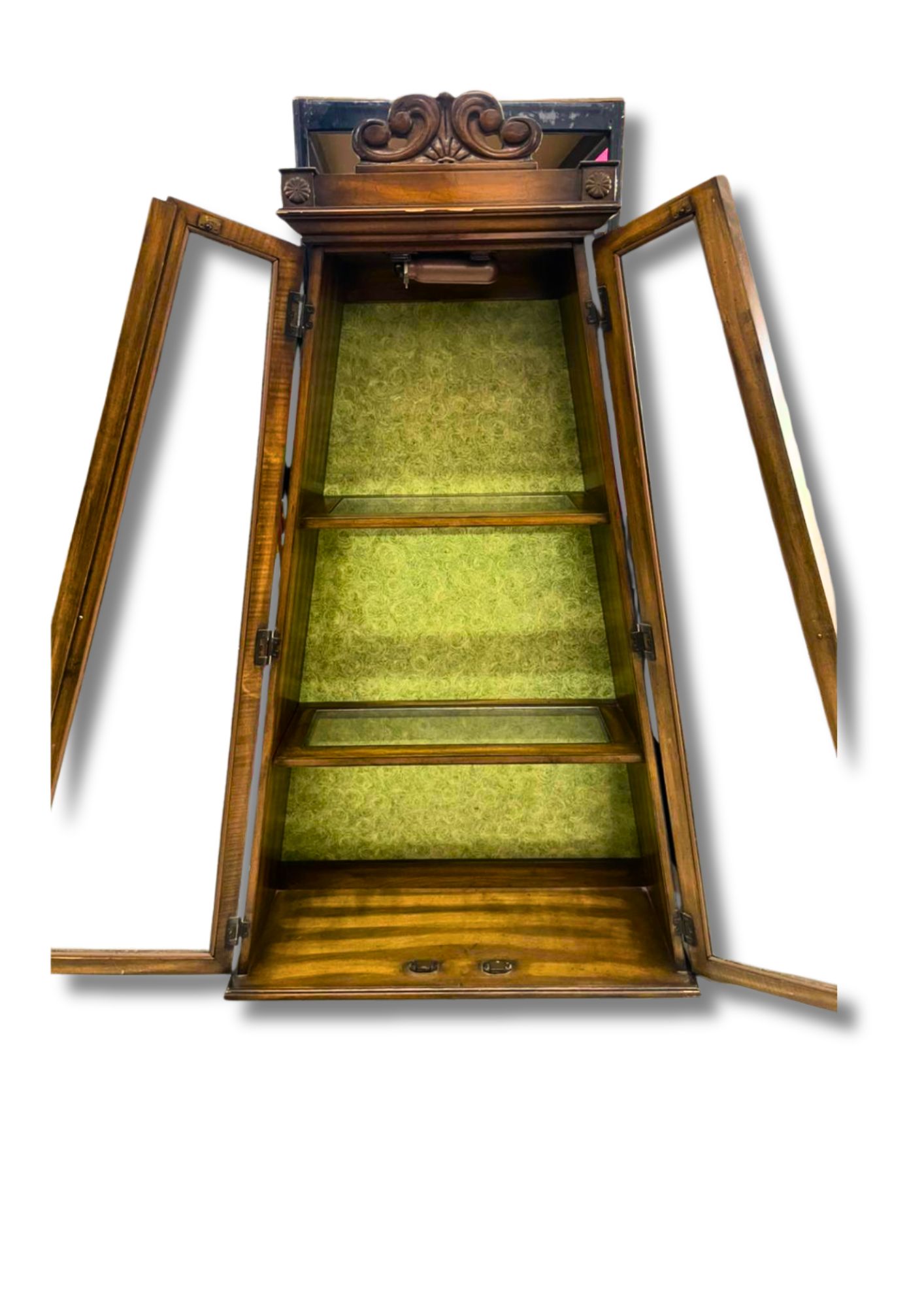 Librera en forma de triangulo vidrio en las puertas, largo 130cm, de ancho 63cm y de alto 142cm